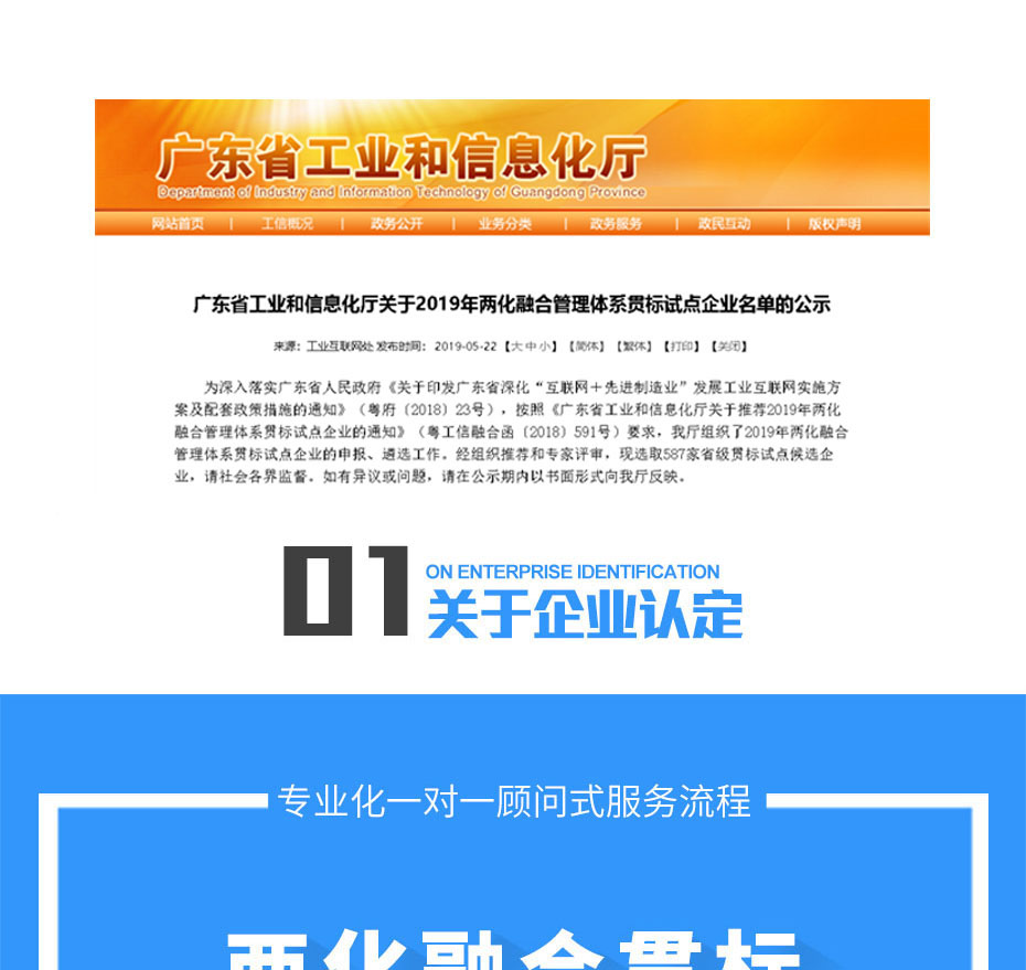 信息化与工业化融合发展简称“两化融合”。两化融合管理体系是企业系统地建立、实施、保持和改进两化融合过程管理机制的通用方法,覆盖企业全局,可帮助企业依据为实现自身战略目标所提出的需求,规范两化融合相关过程,并使其持续受控,以形成获取可持续竞争优势所要求的信息化环境下的新型能力。